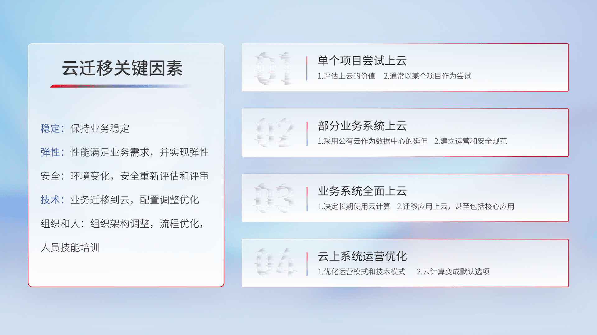 结合实际业务,,,从规划设计、、云平台选型、、、云原生改造、、、数据迁移、、、、集成交付,,迁移全过程为客户识别最佳上云路径,,,做好风险识别管理,,,设计网络架构、、身份权限、、、安全审计合规、、、、操作审计、、、日志审计、、、监控告警策略、、、多站点容灾设计等,,,对云上基础设施进行整体规划,,,,提升IT治理水平,,,以满足弹性、、高可用、、、高性能的需求。。